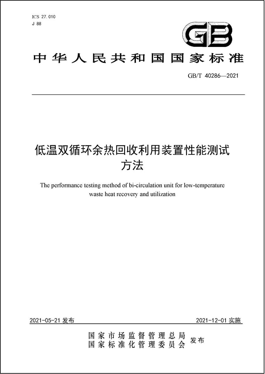 日前,由中节能工程技术研究院有限公司主编、国内12家单位参编的国家标准——《低温双循环余热回收利用装置性能测试方法》(GB/T 40286-2021)获得国家市场监督管理总局和国家标准化管理委员会批准发布,并将于2021年12月1日正式实施。