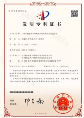近日,中节能实业发展有限公司下属嘉兴公司自主申报的《一种节能建筑户外地板安装结构及其按照方法》的技术成果通过国家知识产权局审查,被授予发明专利权。