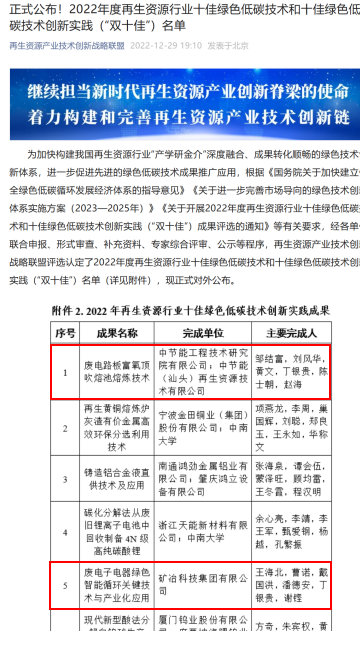 2022年12月29日,再生资源产业技术创新战略联盟正式公布了2022年度再生资源行业十佳绿色低碳技术和十佳绿色低碳技术创新实践(“双十佳”)名单。经评选认定、公示等程序,中研院牵头完成的“废电路板富氧顶吹熔池熔炼技术”、参与完成的“废电子电器绿色智能循环关键技术与产业化应用”共两项技术荣获2022年度再生资源行业十佳绿色低碳技术创新实践成果奖。