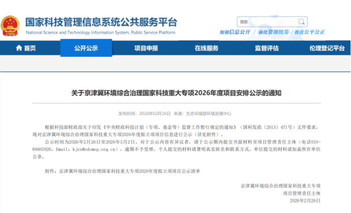 近日,2026年度京津冀环境综合治理国家科技重大专项立项结果正式公布,中节能环境作为课题牵头单位申报的“区域性中心城市固体废物减量-控源-共治关键技术研究与示范”和“渤海湾海洋塑料垃圾源解析与污染防治技术及应用”两个项目,成功获批立项。