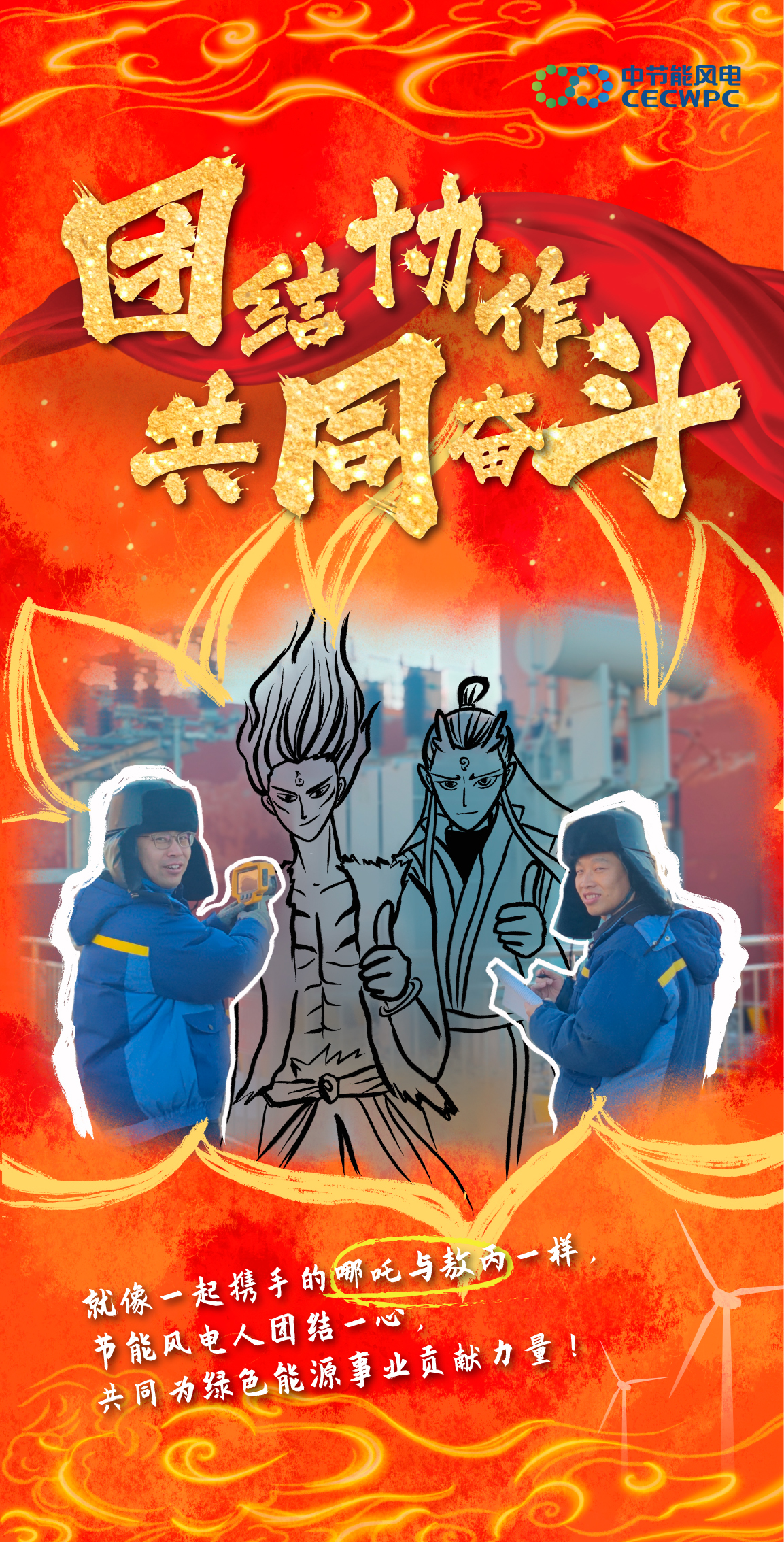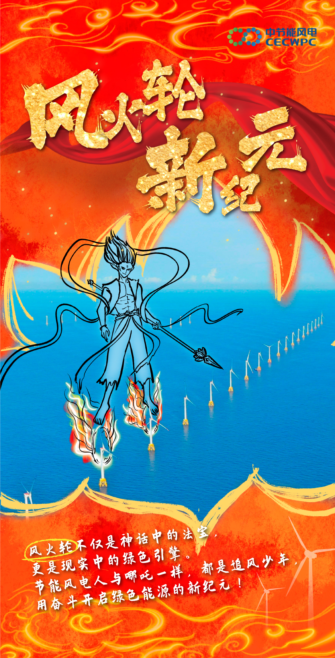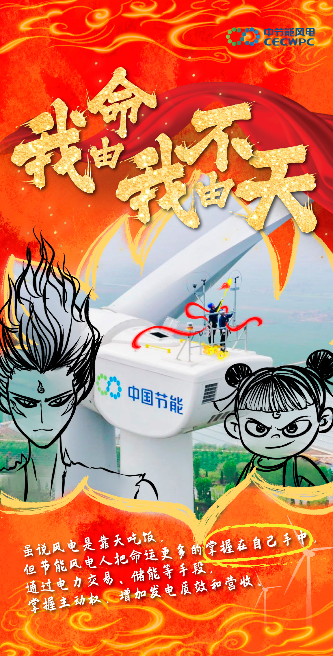 作品一 |【当神话照进现实】来看看风电人与哪吒 能碰撞出什么样的火花吧! 作品类型:手绘作品 作品简介:2025年初,现象级国漫《哪吒之魔童闹海》引爆市场,问鼎全球动画票房冠军。同期,节能风电也在市场开发赛道强势突围,以超180万千瓦的增量实绩,完成里程碑式跨越。影片中“我命由我不由天”经典台词,恰与节能风电突破困境的奋进之路高度契合。在此背景下,节能风电巧妙融合国漫IP与风电行业元素,推出一系列主题海报:风机叶片化“风火轮”、巡检绳缆变“混天绫”、拉闸杆喻“火尖枪”、智慧监控系统拟“数字山河社稷图”……通过东方美学与硬核工业的创意交织,生动诠释绿色发展与文化自信的融合表达。 该策划凭借对热点脉动的精准把握与品牌叙事的创新呈现,入选国务院国资委“第十一届国企好新闻”特别推介作品,实现了破圈传播与文化赋能的双重成效,为融媒体时代的品牌叙事提供了生动范例。