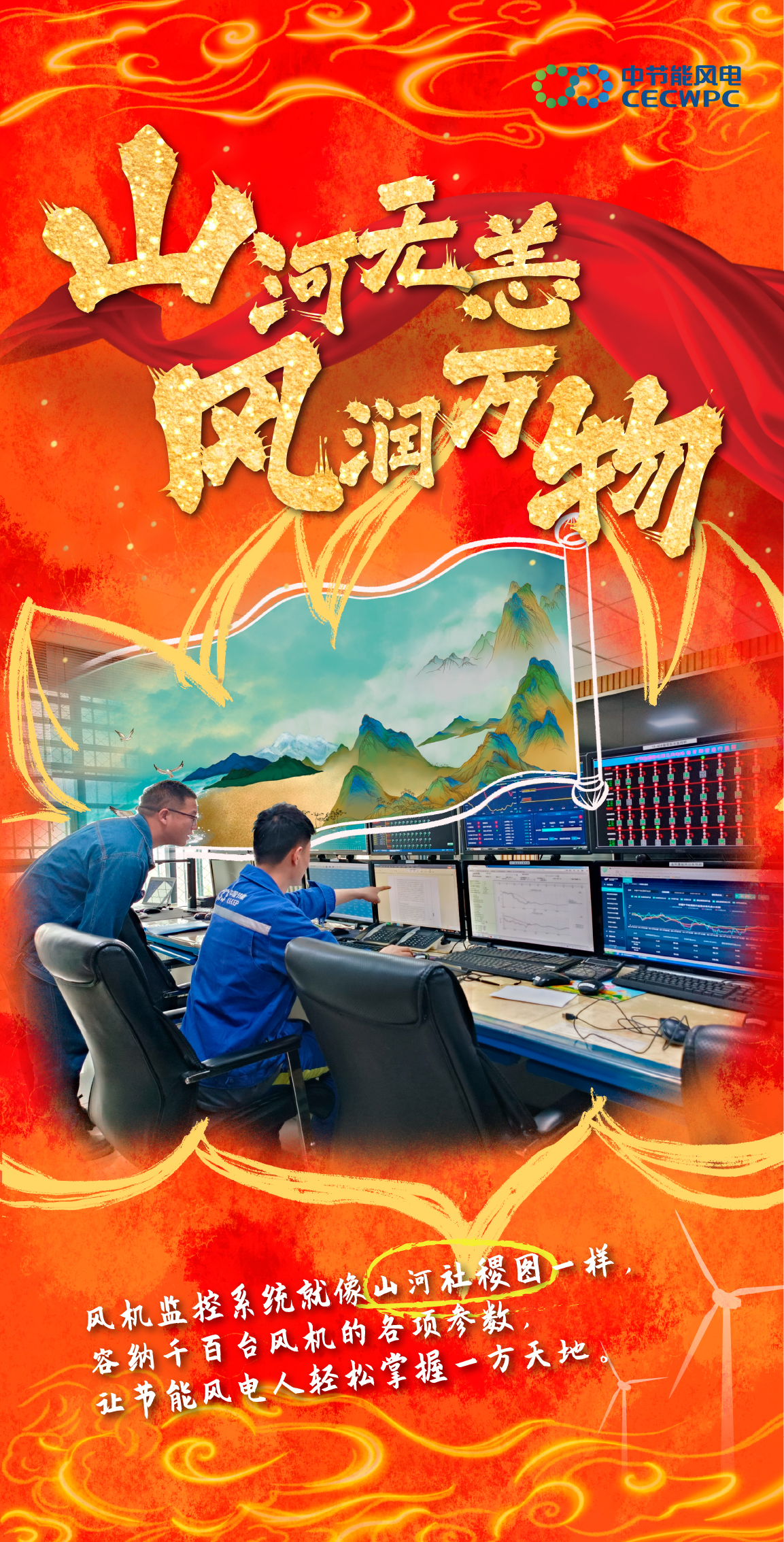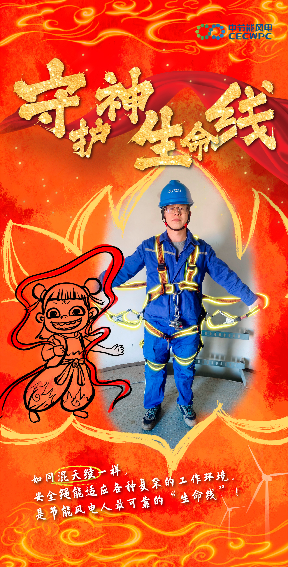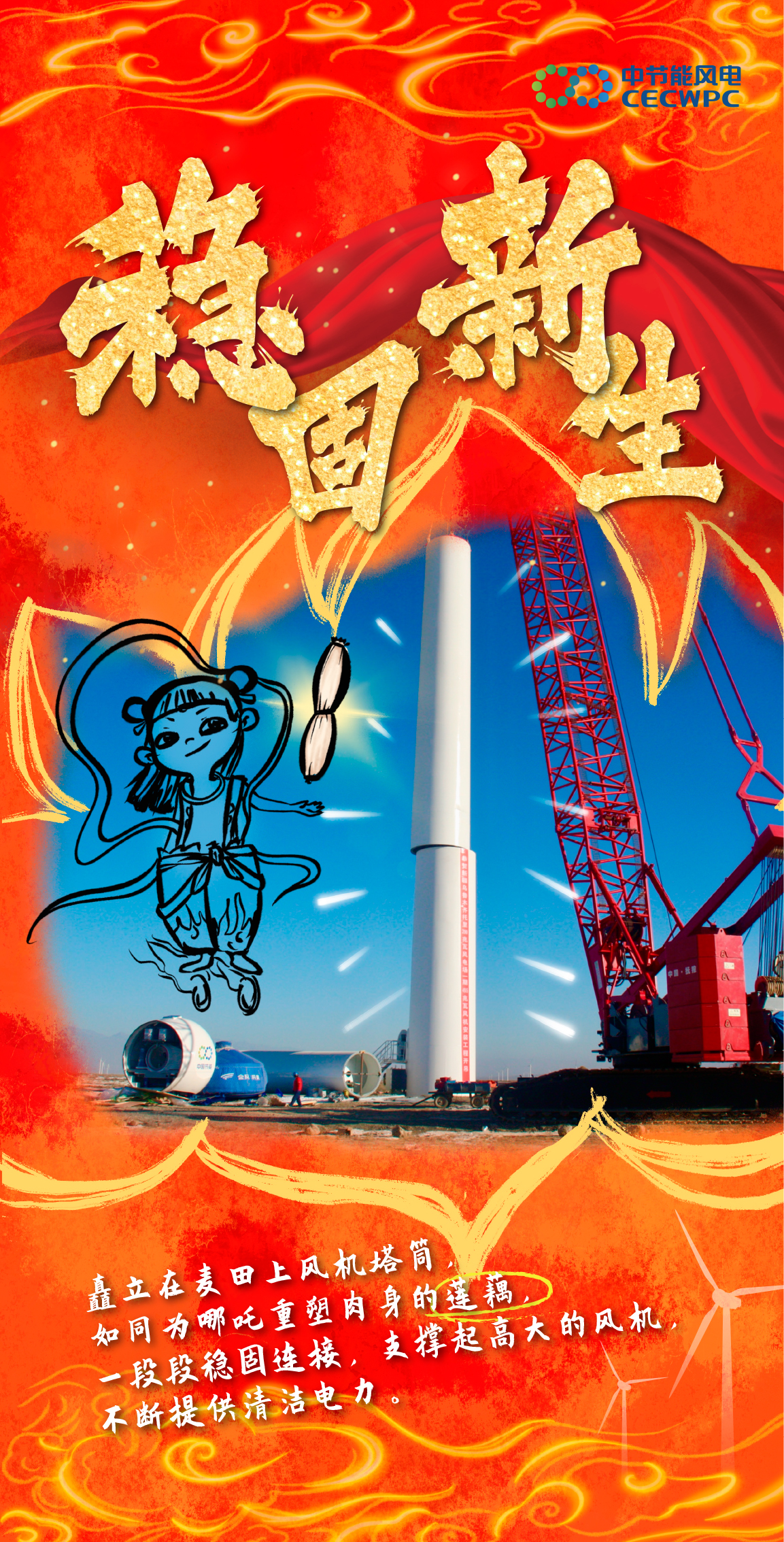 作品一 |【当神话照进现实】来看看风电人与哪吒 能碰撞出什么样的火花吧! 作品类型:手绘作品 作品简介:2025年初,现象级国漫《哪吒之魔童闹海》引爆市场,问鼎全球动画票房冠军。同期,节能风电也在市场开发赛道强势突围,以超180万千瓦的增量实绩,完成里程碑式跨越。影片中“我命由我不由天”经典台词,恰与节能风电突破困境的奋进之路高度契合。在此背景下,节能风电巧妙融合国漫IP与风电行业元素,推出一系列主题海报:风机叶片化“风火轮”、巡检绳缆变“混天绫”、拉闸杆喻“火尖枪”、智慧监控系统拟“数字山河社稷图”……通过东方美学与硬核工业的创意交织,生动诠释绿色发展与文化自信的融合表达。 该策划凭借对热点脉动的精准把握与品牌叙事的创新呈现,入选国务院国资委“第十一届国企好新闻”特别推介作品,实现了破圈传播与文化赋能的双重成效,为融媒体时代的品牌叙事提供了生动范例。
