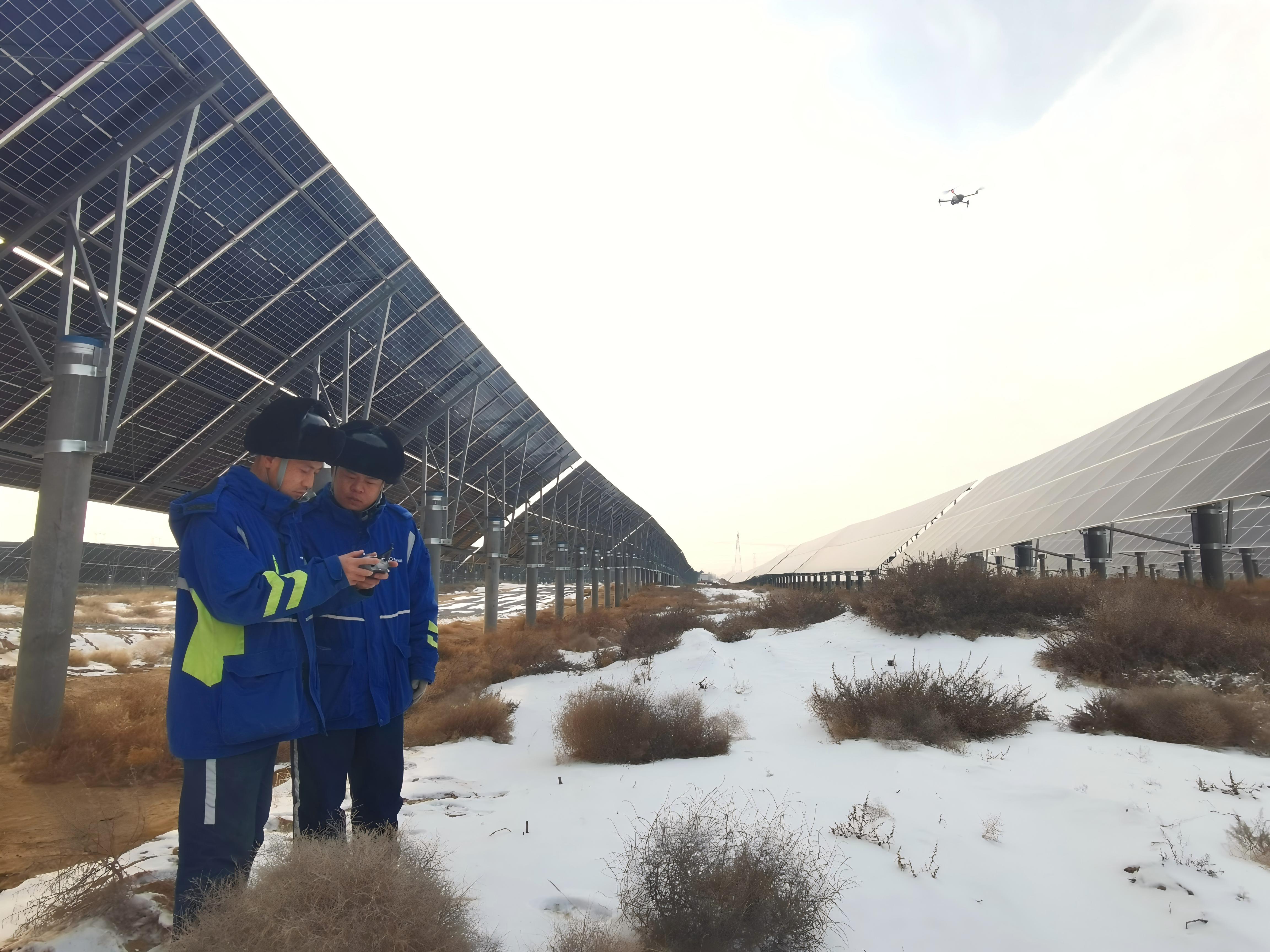 太阳能达拉特旗50万千瓦防沙治沙光伏一体化项目运维人员 正在用无人机巡检光伏组件 科技赋能,稳定供应保安全。面对冬季低温、雨雪等挑战,公司强化技术预案与设备管理。新疆区充分发挥配套储能系统“调节器”作用,平抑光伏出力波动,确保高负荷时段电力稳定输出。西北区、西中区针对极寒天气制定专项预案,加强对箱变、电缆接头、储能系统等关键设备的防冻检查与参数监测,开展预防性消缺,筑牢设备安全运行根基。华东区运用水面清洗机器人等自动化装备,提升组件清洁效率,并建立完善应急预警机制,确保极端天气下电力供应安全可靠。
