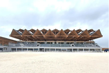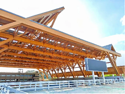 马术场馆屋顶由73000余个、直径20毫米的胶合木螺栓锁住。单榀(双拼)木梁最大长度达96米,木梁跨度66米,最大悬挑20米,系国内最大跨度的木结构体育建筑。 项目时间紧、工艺复杂,项目团队勠力同心、攻坚克难,科学拟定项目计划,合力安排专业工序,统筹调配资源要素,积极配合现场施工,为项目如期交付奠定坚实基础。