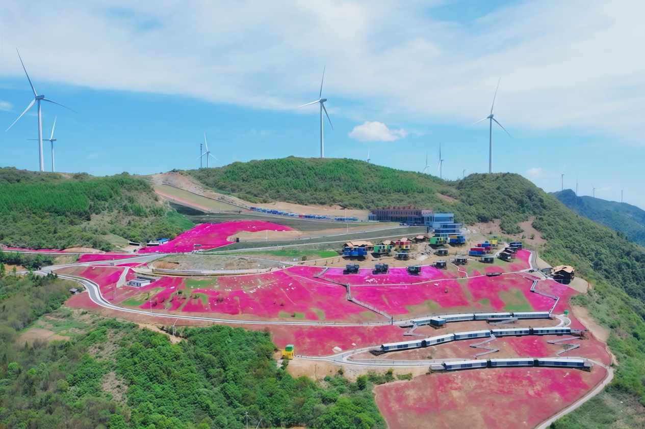(湖北襄州风储一体化项目50兆瓦/100兆瓦时储能电站) 近年来,华中区域公司以湖北为中心,努力在周边省市寻求落地新能源项目的机会。2025年初,湖南临澧桐山100MW风电项目、营驻山50MW风电项目喜获湖南省发改委核准批复,实现了中节能风电在湖南区域风电市场“零”的突破;作为较早布局储能项目的区域公司,湖北襄州风储一体化项目50兆瓦/100兆瓦时储能电站于2024年10月正式并网运行,为公司后续储能项目提供了可复制的样板。截至目前,华中区域公司建成、在建及筹建容量近700兆瓦,储备资源逾千兆瓦。这不仅是数字的跃升,更是绿色动能的澎湃注入。 风车织景,“风电+旅游”绘就新图景 在守护绿水青山的同时,中节能风电更致力于创造金山银山,创新性地探索“风电+旅游”模式,让洁白的风车与当地生态文旅产业擦出了绚烂的火花。特别是北风垭96兆瓦风电项目,当初修通的道路,如今成了游客寻幽探秘的“生态步道”;巍然屹立的风机,与壮美云海、烂漫山花、特色民宿共同构成了一幅动人的“华中屋脊”生态画卷,每年吸引数十万游客前来感受“手可摘星辰”的奇幻,体验高山滑雪的激情,带动了当地“风电+生态旅游”融合的低碳经济新路径蓬勃兴起。