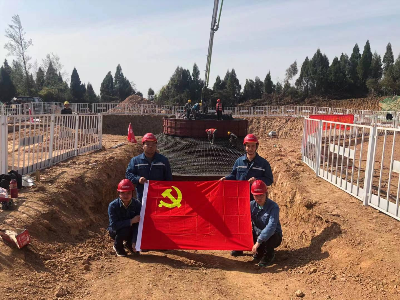 攻坚克难,争效率。在前期工作中,党总支引导项目部全体员工充分发挥业主强化工程管控的积极主动作用,首先根据项目现场条件深入探讨制定各级进度计划,找出关键点,一切工作必须为关键点让行。风场道路是风场施工进度的重要保障,项目部以开辟三条进场道路为切入,迅速扩展各作业面,并适时增加施工机械,最大限度满足现场需求,仅用45天完成所有风机共14.3km机位新建道路的施工任务,为风机基础开挖和浇筑提供了强有力的时间保障。针对剑阁地区气候多变等特点,为保证基础浇筑工作顺利进行,项目部党团员冲锋在前,协调多部门配合开展工作。一是狠抓内部管理,对所有参建人员进行全方位技术及安全交底,并对钢筋、模板及支撑等关键环节进行验收,对施工安全和质量提出了明确要求,对浇筑工艺等方面做了详细的计划方案。二是多方协调,实地考察商砼站综合实力及混凝土运输路线和备用路线,确定混凝土泵送车采用一主一备、确定商混备用站,多举措确保风机基础承台连续浇筑。三是组织监理单位、施工总承包单位及锚栓厂家等管理人员在浇筑过程中全程旁站,监督指导施工单位严格落实既定浇筑方案的各项要求,确保浇筑质量。