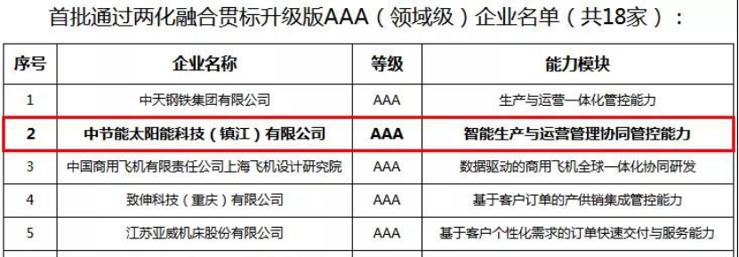 太阳能镇江公司入围全国首批两化融合管理体系升级版贯标达标AAA企业 |