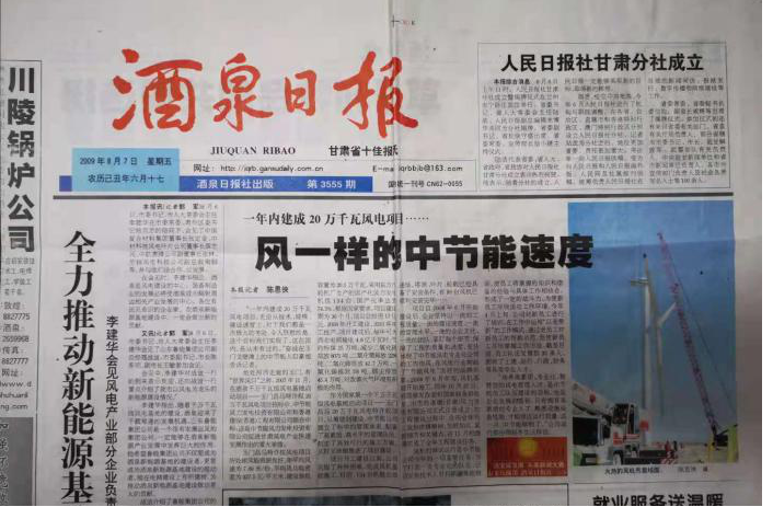 2009年8月8日,是个值得所有中国风电人铭记的庄严时刻,承载着建设“陆上三峡”和甘肃千万千瓦风电基地的希望工程,在中国节能中标的国家首个千万千瓦风电基地启动项目甘肃酒泉风电基地玉门昌马风电场20万千瓦风电特许权项目现场举行一期工程启动仪式。时任国家能源局局长张宝国、甘肃省委书记陆浩、甘肃省长徐守盛以及中国节能党委书记陈津恩等领导出席仪式。自此中国开启了大规模建设风电项目的序章,开启了建设“陆上三峡”浩大工程。