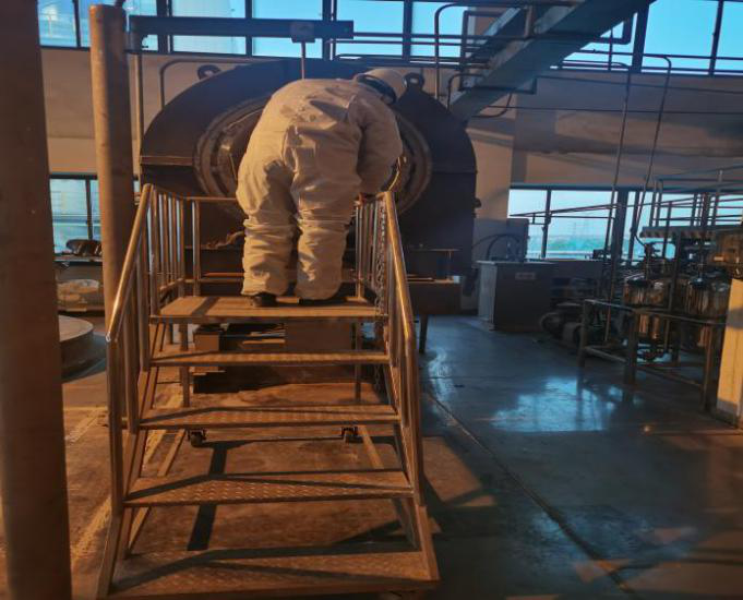 提起分子筛大家可能较为陌生,作为一种人工合成具有筛选分子作用的水合硅铝酸盐或天然沸石,因其吸附能力高、选择性强、耐高温等特点,广泛应用于有机化工和石油化工,是废气净化优良的催化剂与吸附剂。目前,中节能万润股份有限公司沸石环保材料主要应用于高标准汽车尾气排放领域,亦可广泛应用于燃气、燃煤、燃油装置废气治理及其它多种领域,而生产三部十二号车间正是万润沸石环保材料梦想起航的地方。 2020年8月26日,十二号车间的二段焙烧炉检修,为了掌握炉内准确的情况,制定最优检修方案,身为共产党员、车间主管的孙宝林决定亲自进炉检查。焙烧炉内狭长,高度仅八十五公分左右,宽度约六七十公分,一根纵轴贯穿整个炉膛,纵轴每隔一段距离就铸有像风扇叶一样的三角刮片,炉壁上方也分布着大大小小不规则的破碎刀具,内部结构极其复杂,这对于身高近一米八,体重七十五公斤的孙宝林来说绝非易事,在炉膛里面既不能直立也不能躬腰,在近乎密闭的环境中,光是从炉尾爬到炉头这样的贯穿行程,如果不拿出点大型节目里面那种闯关的劲头儿,一般人也是无论如何都坚持不下来的,更何况还要从容镇定一气呵成地同时完成检查、标记、记录的整个排查过程。