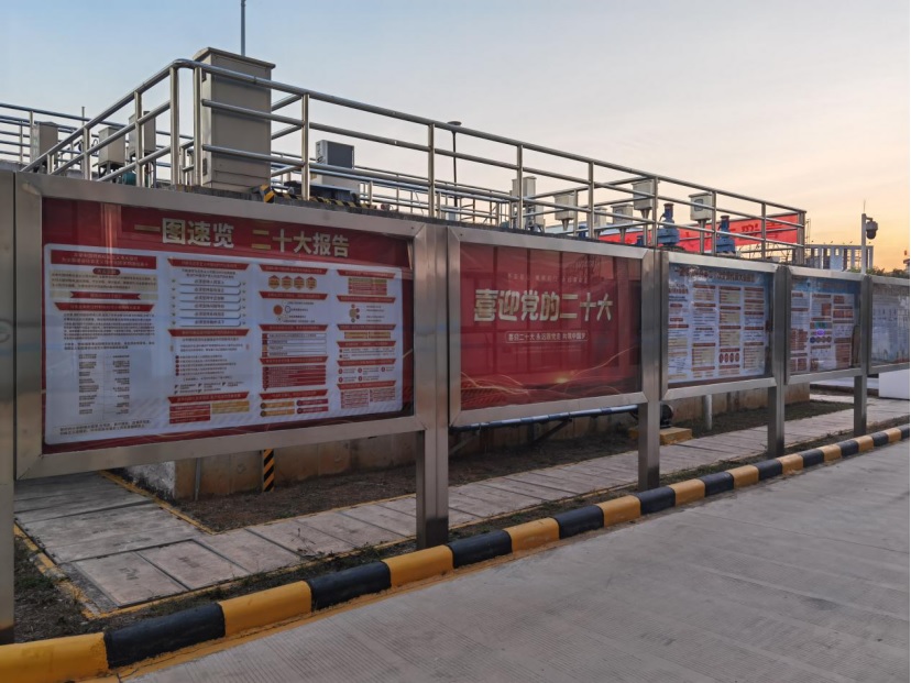 中环水务党委坚持学习宣传一体推进、相互促进。中环水务官网、官微、小程序、企业内刊四位一体、综合发力。精心策划二十大宣传专题、专栏和专刊。下属遂溪公司党支部在城月总厂区张贴二十大精神系列海报,其他11个厂区通过拉横幅、张贴二十大精神要点等形式将党的二十大精神宣传到基层。温州中环党支部制作专题宣传栏,并通过LED电子显示屏、QQ群、微信群、生产会议等载体,大力宣传二十大精神,做到二十大金句人尽皆知,营造了浓厚的宣传氛围。蚌埠中环党委利用机关大院3块LED屏循环滚动宣传二十大精神,并在大楼门厅处制作、展示党的二十大报告解读宣传板报。