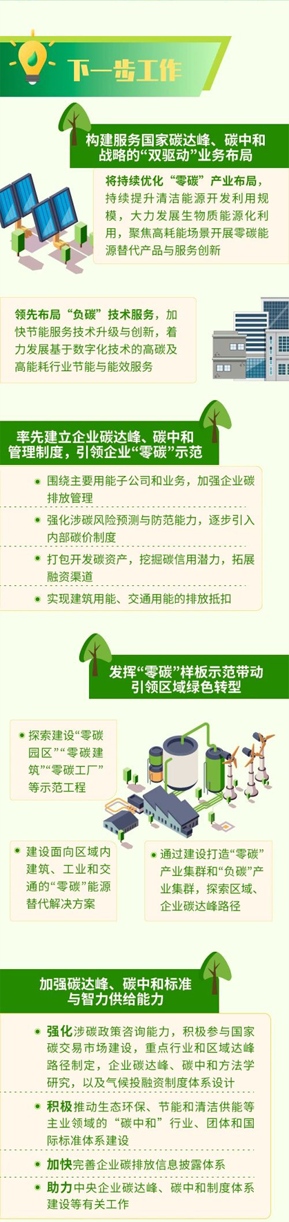 下一步,中国节能将不断提升推动国家“碳中和”目标实现的咨询规划和资源统筹能力,探索构建服务国家“碳中和”愿景的“零碳产业+负碳技术”双驱动布局,建立领先的“双碳”制度体系,着力加强“双碳”标准与智力供给能力。