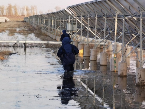 项目并网以后往往得花更多的时间去维护发电设施,这就要求运维人员将已经损坏的设备替换下来,以保证整个系统的正常运行。自8月份以来,突如其来的三场台风给设备安全稳定运行带来严峻考验。进入电站的必经之路已被大水淹没,根本看不到路在哪里,所见之处,都是积水,多处道路已变成深水区,运维人员没有退缩,“没有路也要创造路,就算蹚也得把设备送进去”。于是,运维人员便经过深水区运送设备,湿透半截的裤管是不惧台风影响最好的证明。地面积水严重,而光伏组件高度大多超过3米,被水浸泡过的地面无法固定绝缘梯,这给运维人员维护发电设备制造了严重障碍,检修设备难度大大增加,但这依然阻挡不了运维人员进行设备运维的决心。面对地面无法固定梯子的困境,运维人员纷纷化身“智多星”,群策群力,出谋划策,最后决定在绝缘梯顶端加装挂钩,再用顶端的挂钩悬挂在光伏支架上进行维护,解决运维难题。 气温骤降,寒风飒飒;不惧严寒,站好每一班岗。 由于太阳能华北区吉林片区地理位置特殊,常年伴有天气转凉的迹象,在寒冷的天气下工作已经是运维人员的工作常态,但是在零下30-40度的严寒气温下进行设备巡检工作,还是给运维人员带来了极大的挑战。在巡检现场,经常可以看到扶在设备上面的手冻得通红,已经变得僵硬。严重的时候甚至很难进行正常的维护工作,回暖也需要好一阵子。可是时间就是发电量,设备提前一分钟维护好,我们就多发一度电。光伏厂区严禁烟火,于是运维人员只能用体温取暖的方式,将自己的手揣在衣服里贴着皮肤来进行缓解,只有这样才能既保证安全,又能将设备检修故障尽快完成。 并网在即,关卡重重;尽心尽力,发挥最大的价值。