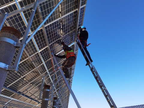 太阳能华北区通榆电站自入秋以来,突如其来的三场台风给设备安全稳定运行带来严峻考验。厂区积水严重,多处道路变成深水区,给设备安全稳定运行带来极大隐患,且地面积水无法架设绝缘梯,给运维人员检修发电设备制造了严重障碍,检修设备难度大大增加,但电站运维人员不等不靠,纷纷化身“智多星”,群策群力,出谋划策,最后决定在绝缘梯顶端加装挂钩,再用顶端的挂钩悬挂在光伏支架上进行维护,解决运维难题。 埋头苦干战严寒,提质增效保发电
