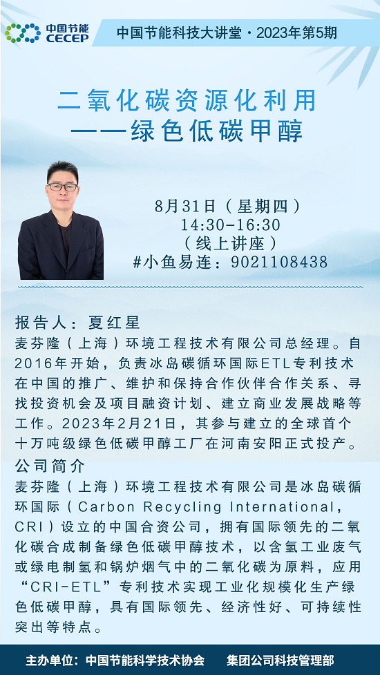 为加强绿色低碳技术交流,促进战略性新兴领域和行业前沿领域产业技术合作,集团公司科技管理部、中国节能科协特邀请麦芬隆(上海)环境工程技术有限公司(以下简称麦芬隆公司)总经理夏红星先生于2023年8月31日作科技大讲堂专题讲座。现将有关事项通知如下: