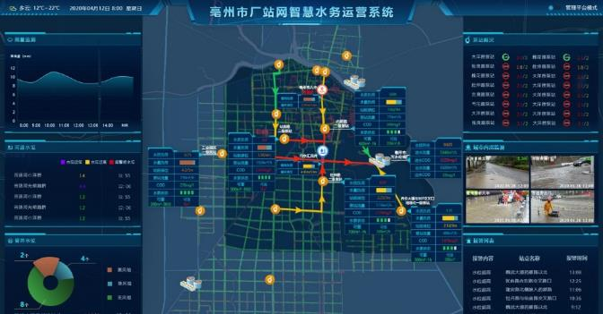 通过亳州市供排水智慧运营平台,一张图纵览污水处理厂、泵站、管网实时数据,开展远程管理与调控。项目覆盖污水处理厂3座,总规模12万吨/日;中水厂2座,总规模7万吨/日;污水管网373公里,雨水管网643公里,污水泵站13座,雨水泵站5座。
