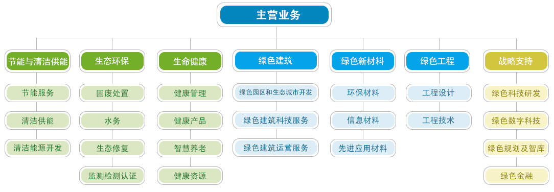 中国节能主业涉及节能、环保、健康、清洁能源及节能环保综合服务(包括相关监测评价、规划咨询、设计建造、工程总承包、运营服务、技术研发、装备制造和产融结合)。目前,中国节能在工业节能、建筑节能、固废处理、污水处理、烟气治理、环境监测、土壤修复、重金属治理、风电、太阳能、新材料、健康产业等多项细分业务领域,规模和实力国内领先。