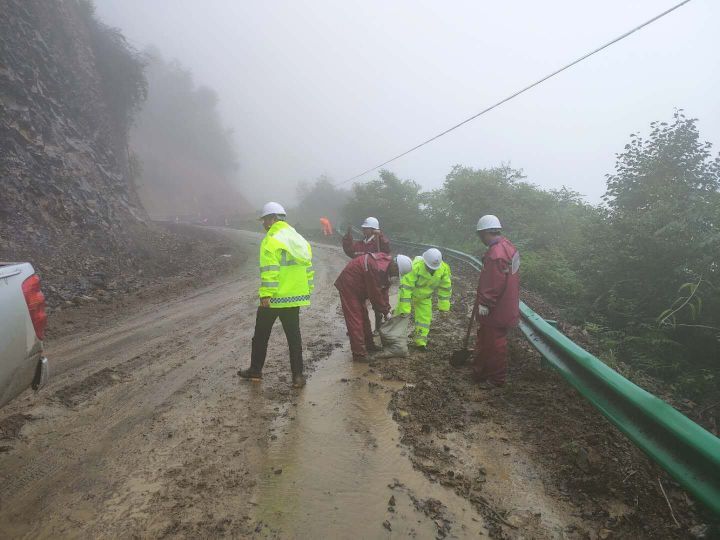 Workers of Wufeng Company clean silt and falling rocks on the road near the Niuzhuang project.