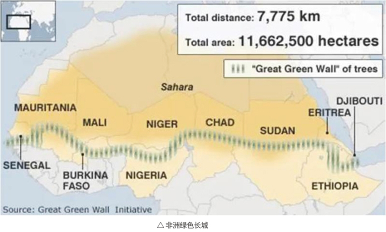 The Great Green Wall of Africa is a pan-African vegetation barrier initiative established in 2007 through a resolution by the African Union. It encompasses all the arid and semi-arid regions north and south of the Sahara Desert. The core area covers a total landmass of 780 million hectares and involves a population of 232 million people. It has now become a "green barrier" for the economic and social development of Africa and is referred to as a symbol of Africa's readiness to face the future.