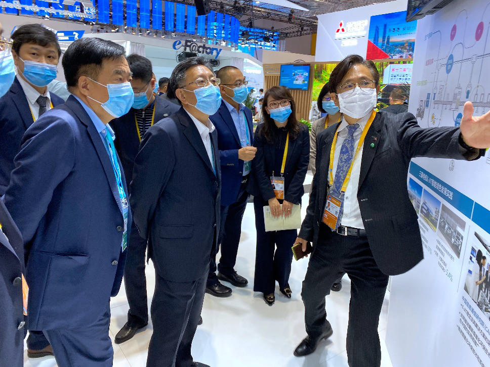 The 3rd China International Import Expo (CIIE) opened in Shanghai on November 4. On the morning of November 5, Song Xin, chairman of China Energy Conservation and Environmental Protection Group (CECEP), and Deputy CEO Liu Dajun led the company’s delegation to visit the Technical Equipment exhibition area at the CIIE. There, they gained insight into intelligent manufacturing and frontier technologies on display, and held talks with Tomizawa Katsuyuki, corporate executive and chief representative in China of Mitsubishi Electric Corporation, for future cooperation.