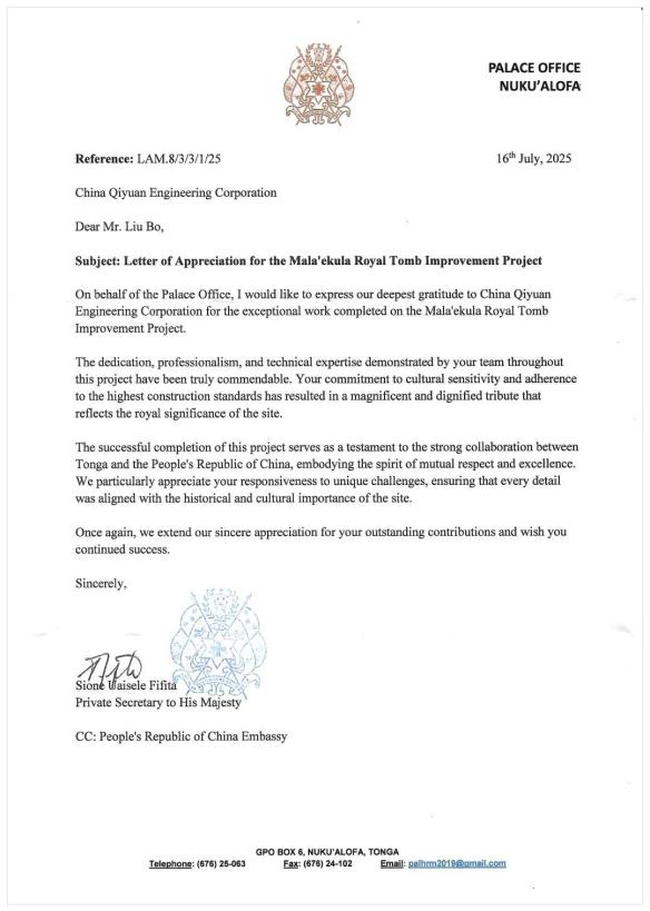 CQEC, a subsidiary of CECEP, recently saw the China-aided Mala’ekula Royal Tomb Improvement Project in Tonga enter its final acceptance stage. The Private Secretary to His Majesty/Chief of the Palace Office, and the Deputy Prime Minister and Minister for Infrastructure of Tonga, sent letters to CQEC on behalf of the Tongan government, commending and recognizing the project management team.